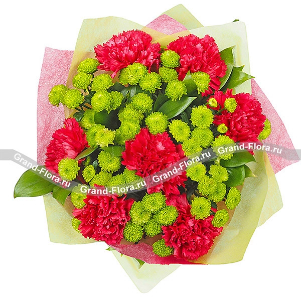 Летний, кокетливый, яркий — все сплелось в этом букете. Красные гвоздики и миниатюрные зеленые хризантемы поднимут настроение на весь день. Глядя на такой букет, невозможно не улыбаться — ведь из него пышет энергия, жажда жизни, позитив. Вы можете выбрать абсолютно любой повод, чтобы подарить это волшебство, ведь нет ничего ценнее улыбки близкого человека.