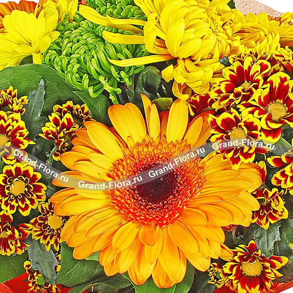 ЛЮКС: гербера оранжевая - 5 шт., хризантема желтая одноголовая - 2 шт., хризантема зеленая одноголовая - 2 шт., хризантема желтая кустовая - 2 шт., хризантема кустовая оранжевая - 3 шт., салал, оранжевый фетр.